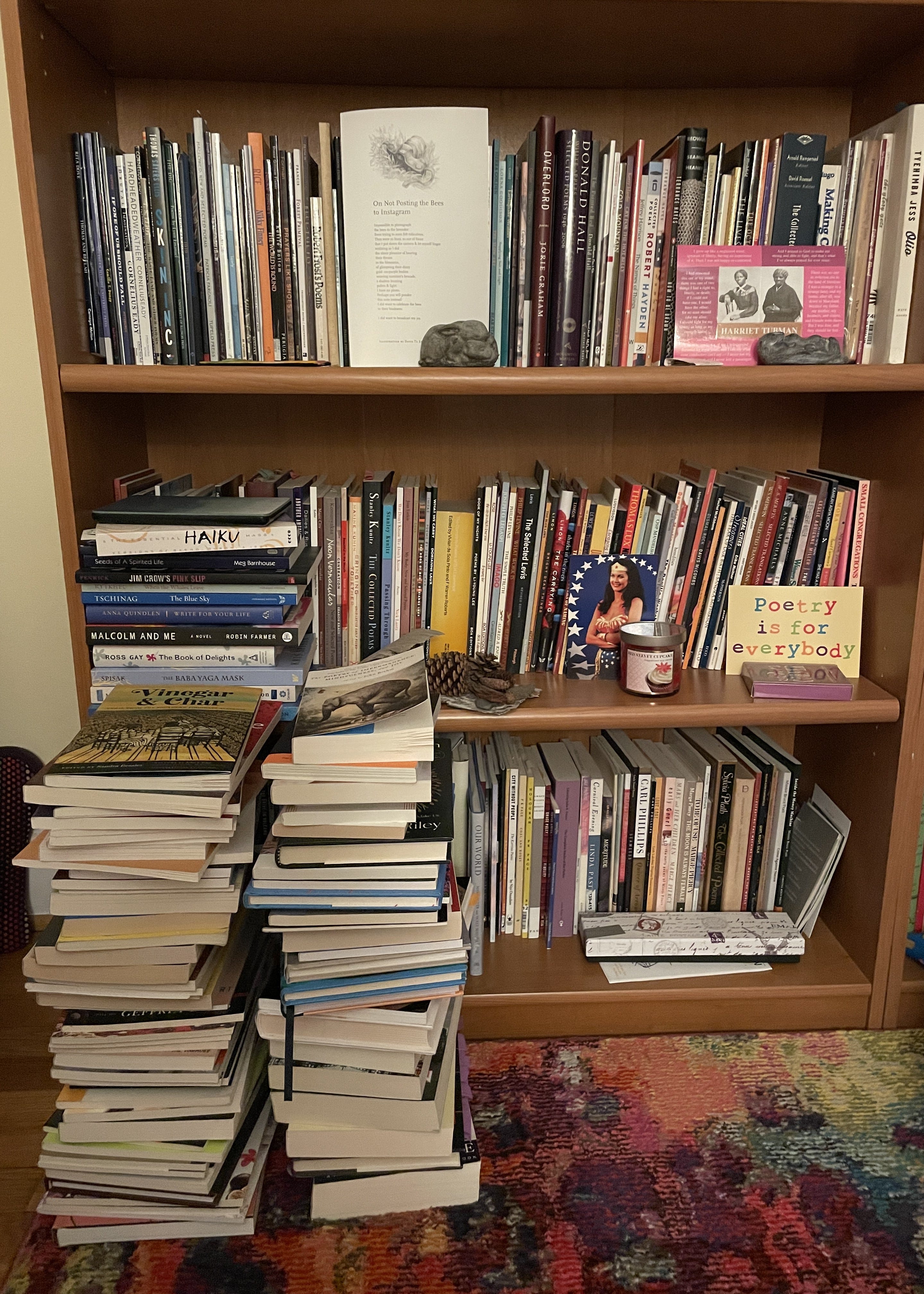 Now, about that list. My track record at remembering to add books as I read them won’t win me any ribbons. In my eagerness to keep reading, I often forget for several weeks, then use the timelines in apps like Libby (yeah, public libraries!), Libro.fm, and Audible, and the reading history on my Kindle to catch up. Print books (the ones that aren’t from a library) get stacked on one of two growing towers on the floor of my study. These stacks include books I’ve finished reading and ones I’ve acquired (often at a poetry festival, writing conference, or Little Free Library) but haven’t read yet. To find those missing from my list, I scan the top five or six on both stacks.